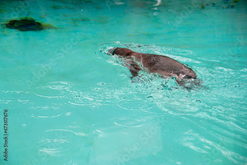 Obraz premium Humboldt penguin swims in blue clear water.
