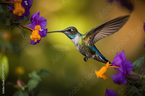 © Gelpi, Fototapeta premium Humming bird hovering over colorful, pollen filled flowers. Generative AI