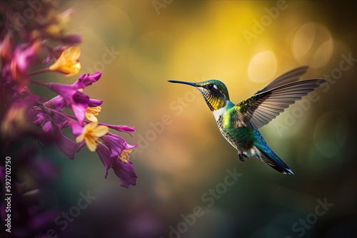 © Gelpi, Fototapeta premium Humming bird hovering over colorful, pollen filled flowers. Generative AI