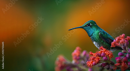 Fototapeta premium Humming bird hovering over colorful, pollen filled flowers. Generative AI
