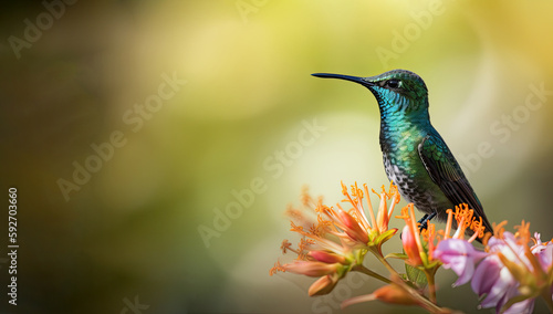 © Gelpi, Fototapeta premium Humming bird hovering over colorful, pollen filled flowers. Generative AI