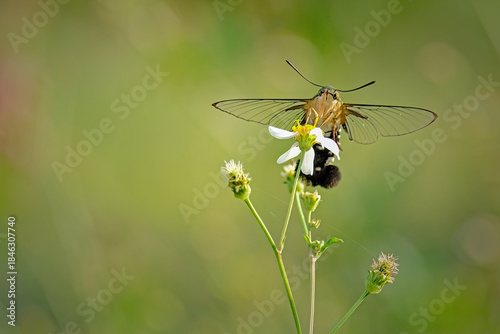 © Riadi, Fototapeta premium humming moth sucking pollen at garden