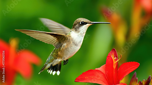 Obraz premium hummingbird. A hummingbird hovers near a red flower, its wings moving fast against a green background. wildlife magazines, conservation campaigns, designed for nature documentaries and education.