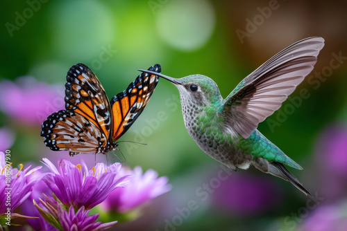 Fototapeta premium Hummingbird and Butterfly Near Purple Flowers