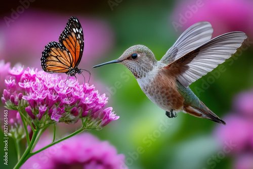 Fototapeta premium Hummingbird and Butterfly on Pink Flower