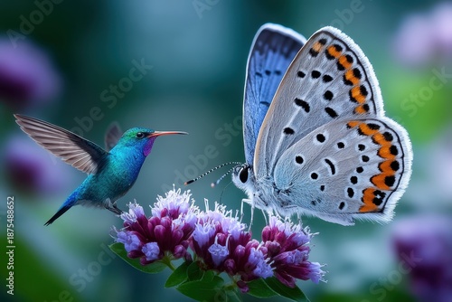 Obraz premium Hummingbird and Butterfly on Purple Flower