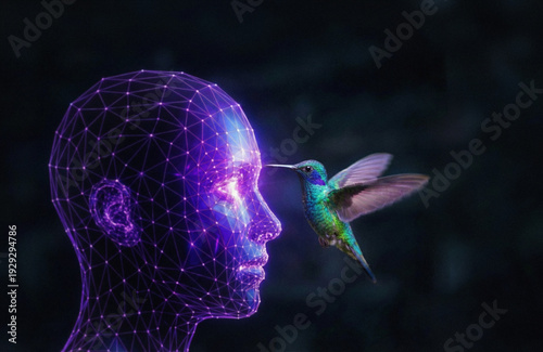Fototapeta premium Hummingbird approaching glowing AI hologram