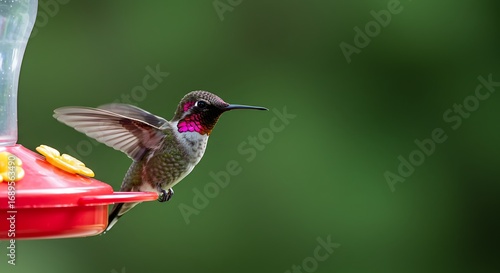 © Endy, Fototapeta premium Hummingbird at Feeder with Red Throat and Spread Wings.
