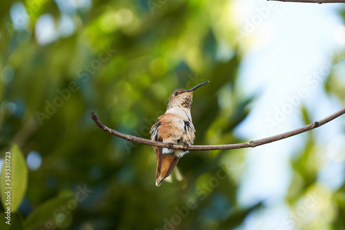 © Mauricio, Obraz premium Hummingbird Brown Resting on Maple branch. Preening feathers. Different head positions. Looking left and Right.