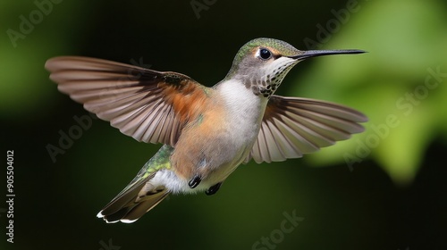 © MakoPoko, Fototapeta premium Hummingbird captured in mid-flight, displaying intricate feather patterns and graceful movement.