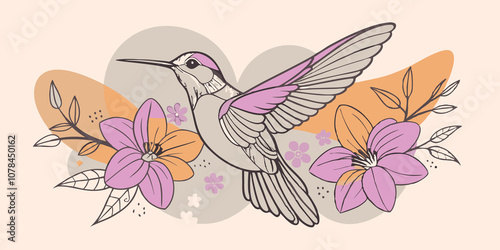 Fototapeta premium Hummingbird Dance A colorful hummingbird in motion surrounded by blossoms highlighting the themes of joy agility and the moment of life.