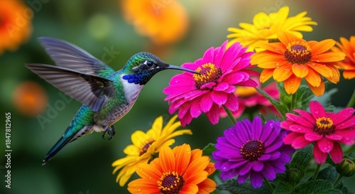 © Tujuenam, Naklejka premium Hummingbird delighting in vibrant zinnias a dance of nature's harmony and beauty