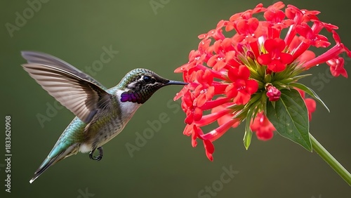 © Shreya777, Fototapeta premium Hummingbird drinking nectar from red flowers