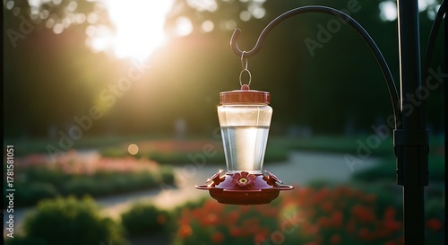 Obraz premium Hummingbird Feeder in Garden at Sunset.
