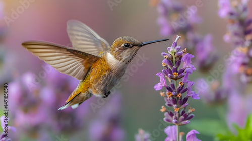 Fototapeta premium Hummingbird feeding lavender flowers.