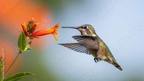© Sadek, Naklejka premium Hummingbird feeding on a bright orange flower in soft light