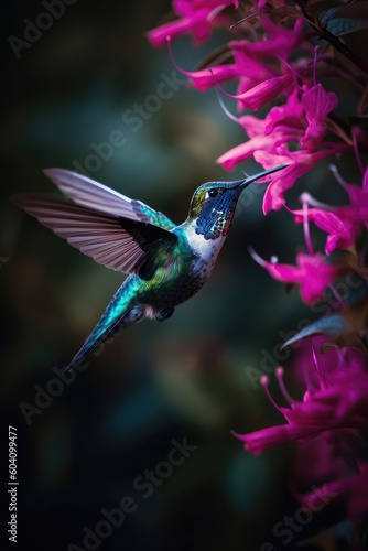 Fototapeta premium Hummingbird feeding on a flower. Generative ai.