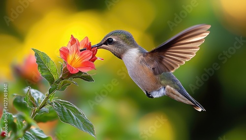 Fototapeta premium Hummingbird feeding on a vibrant orange flower