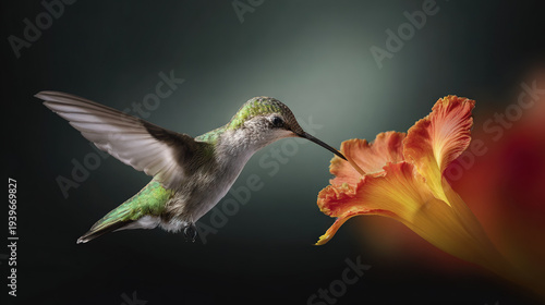 © Anna, Fototapeta premium Hummingbird Feeding on Bright Orange Flower