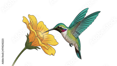 © Alfan, Obraz premium Hummingbird Feeding on Bright Yellow Flower in Nature (6)