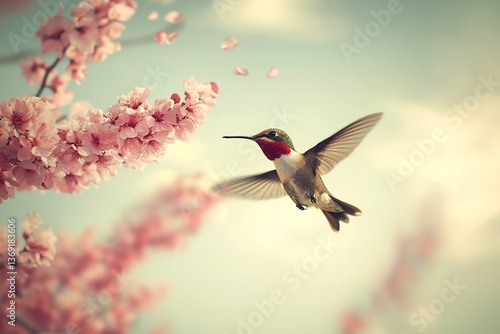 Fototapeta premium Hummingbird feeding on cherry blossoms, spring