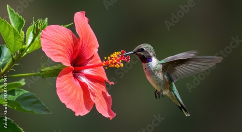 © DIAN, Fototapeta premium Hummingbird Feeding on Flower Nectar From a Vibrant Red Hibiscus