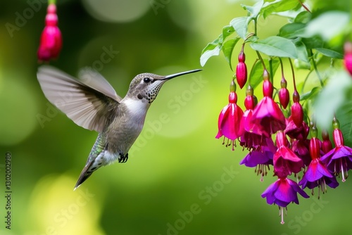 © malayeka, Fototapeta premium Hummingbird feeding on fuchsia flowers.