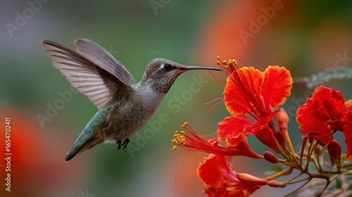 © Fahrun, Naklejka premium Hummingbird feeding on orange flowers
