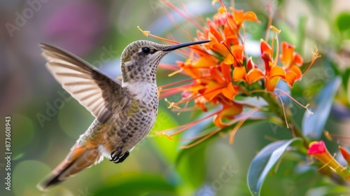 Fototapeta premium Hummingbird Feeding on Orange Flowers.