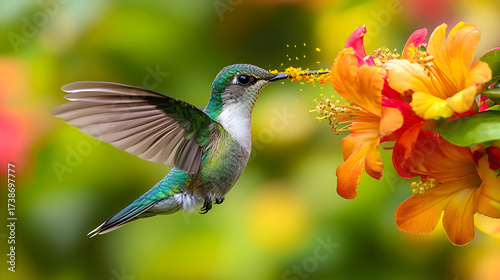 Fototapeta premium Hummingbird feeding on orange vibrant flower nectar
