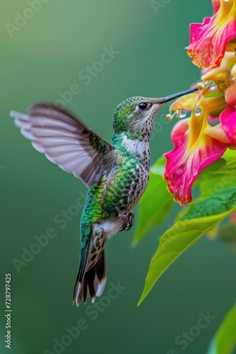 © Landscape Planet, Obraz premium Hummingbird Feeding on Pink and Yellow Flower in Mid-Air Close-Up