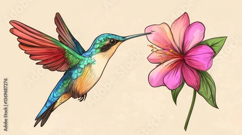 Obraz premium Hummingbird feeding on pink flower, nature background, garden art