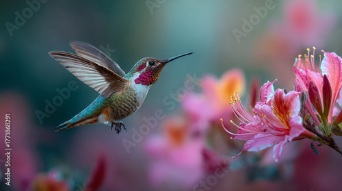 © Alive, Fototapeta premium Hummingbird feeding on pink flowers during springtime