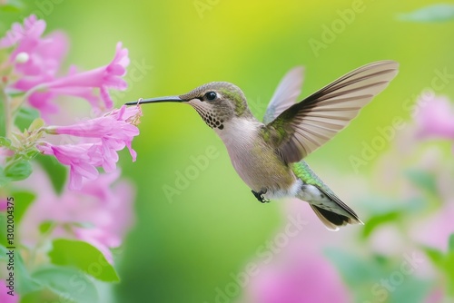 © malayeka, Fototapeta premium Hummingbird feeding on pink flowers in flight. (2)