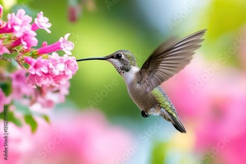 © malayeka, Naklejka premium Hummingbird feeding on pink flowers in flight.