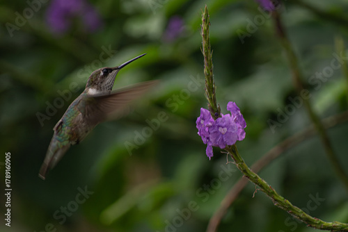 Fototapeta premium Hummingbird Feeding on Purple Flower in Tropical Garden