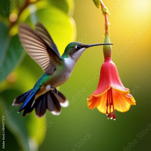 © pranto, Naklejka premium Hummingbird feeding on red flower
