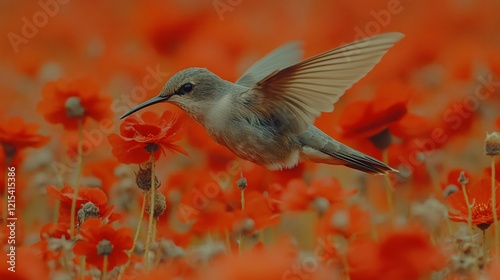 © kinkin, Obraz premium Hummingbird feeding on red poppies in a field.
