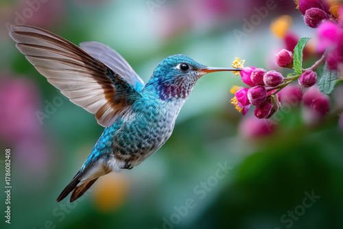 © YouraPechkin, Fototapeta premium Hummingbird feeding on vibrant flowers in a lush garden during daylight