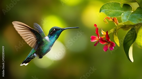 © Alexar_JavaCreator, Naklejka premium Hummingbird feeding on vibrant flowers in lush greenery natural garden organic environment close-up view