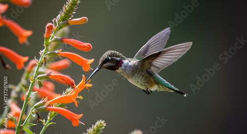Fototapeta premium Hummingbird feeding on vibrant orange trumpet flowers, a close-up of nature's...
