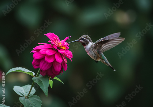 © Nilima, Naklejka premium "Hummingbird Feeding on Vibrant Pink Dahlia Flower Mid-Air