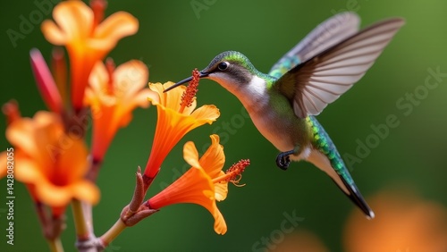 © Gayan, Fototapeta premium Hummingbird Feeds On Orange Flowers-Close Up