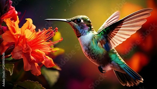 Fototapeta premium Hummingbird & Floral Nectar – Bright, dynamic motion of a bird mid-flight