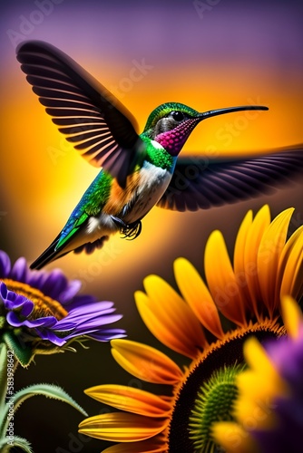 © Lokman, Obraz premium Hummingbird flying about to land on a sunflower