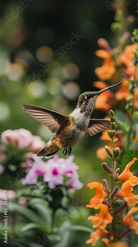 Obraz premium Hummingbird Flying Amongst Vivid Summer Blooms