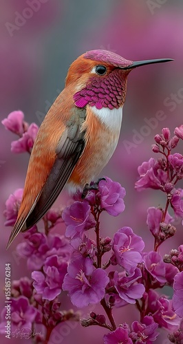 © MstAfrin, Fototapeta premium Hummingbird flying and feeding on a flower in a natural garden setting