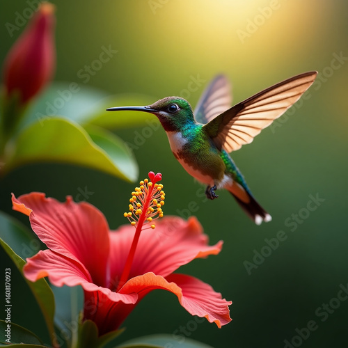 © Shakib, Fototapeta premium Hummingbird flying and feeding on a flower with vibrant feathers in nature