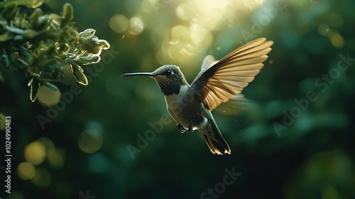 Naklejka premium Hummingbird flying in air with open wings, sun shining through trees in...