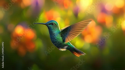 © Alice, Fototapeta premium Hummingbird flying in orange, yellow, and purple blurred background of flowers